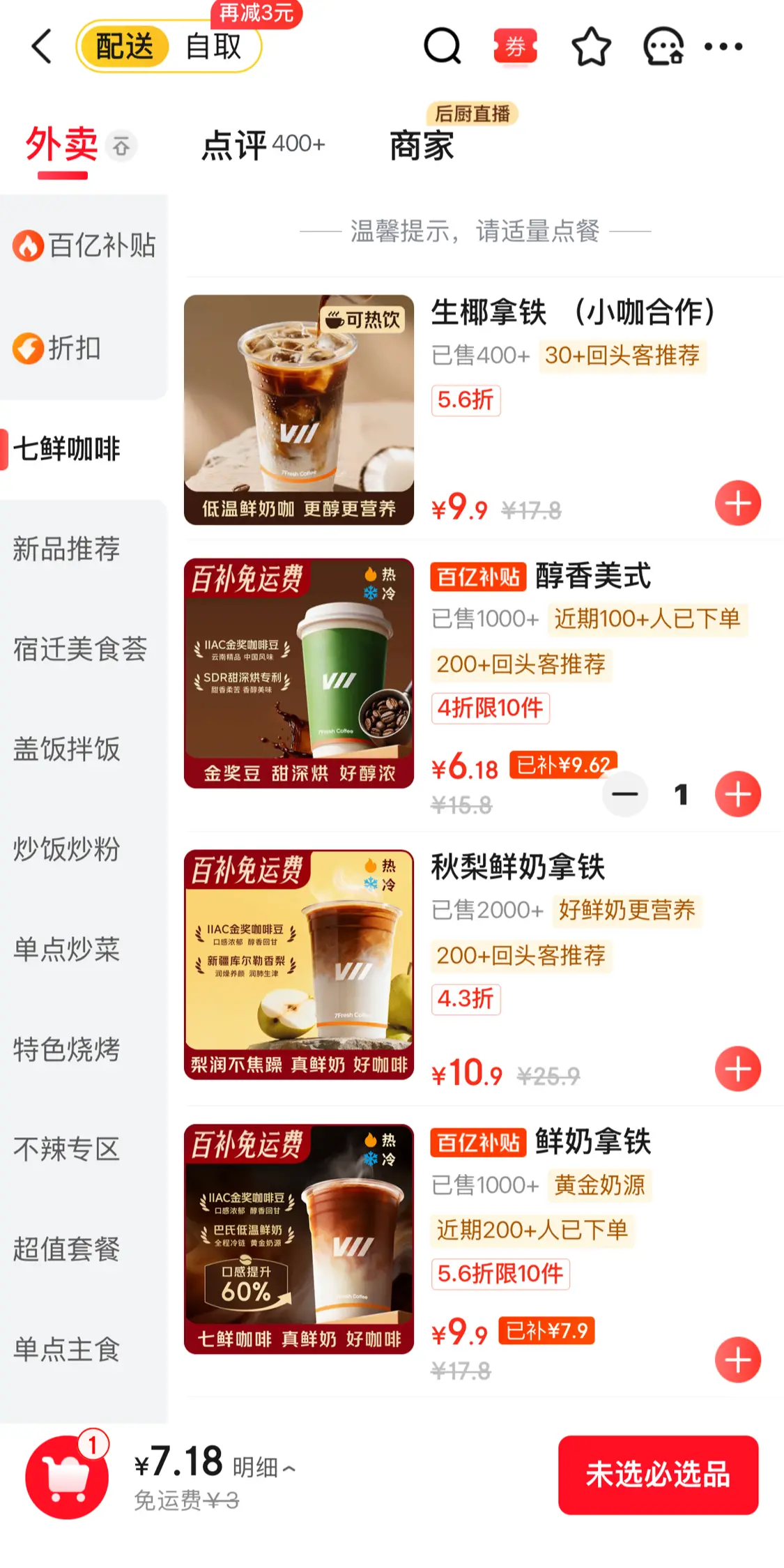 11月17日,京东正式推出自有咖啡品牌“七鲜咖啡”,主打“只用鲜奶”的健康理念,该品牌在“东哥品酒会”上正式亮相,刘强东现身活动现场。该品牌已在京东平台上线,产品线覆盖生椰拿铁、醇香美式、秋梨鲜奶拿铁等多款现制饮品。并推出“百亿补贴”优惠活动,部分现制咖啡价格打至10元以下,其中“醇香美式”券后价低至6.18元。