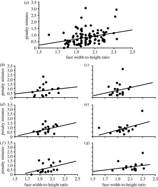 六支加拿大球队的男性职业曲棍球运动员的面部宽高比和攻击性行为之间的关系: (a) 总体分析,b-g单独球队分析,图源:参考文献 [3]