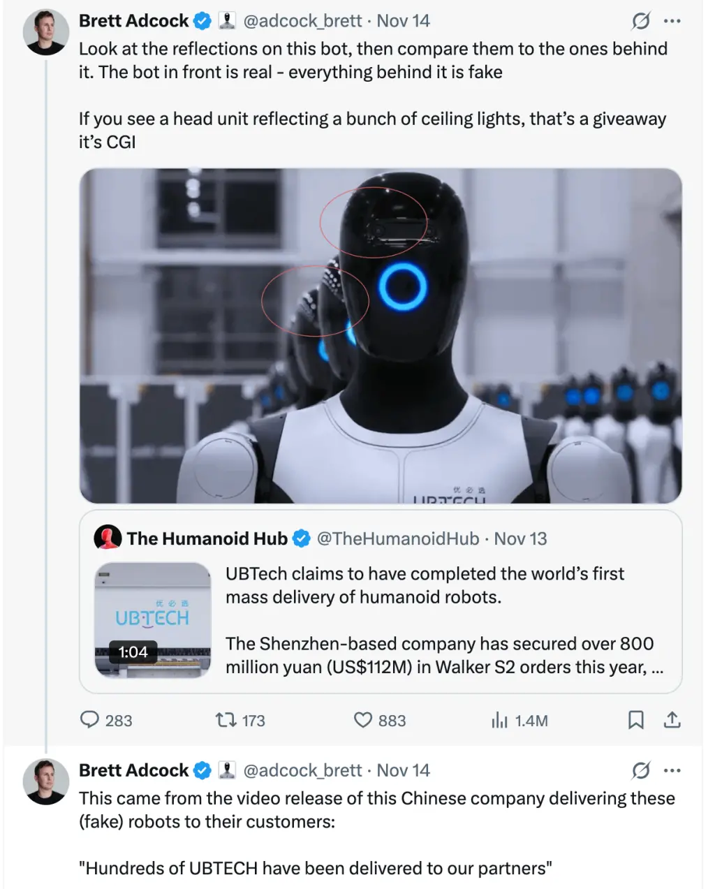 优必选回应外企公开质疑。11月18日,优必选(09880.HK)就“人形机器人Walker S2开启量产交付的视频为CG制作”作出回应,称该说法完全失实。此前,优必选发布了工业人形机器人Walker S2量产交付视频。Figure创始人布雷特·爱德考克(Brett Adcock)在社交平台公开质疑视频中是“fake robots”,大概率是电脑特效制作。