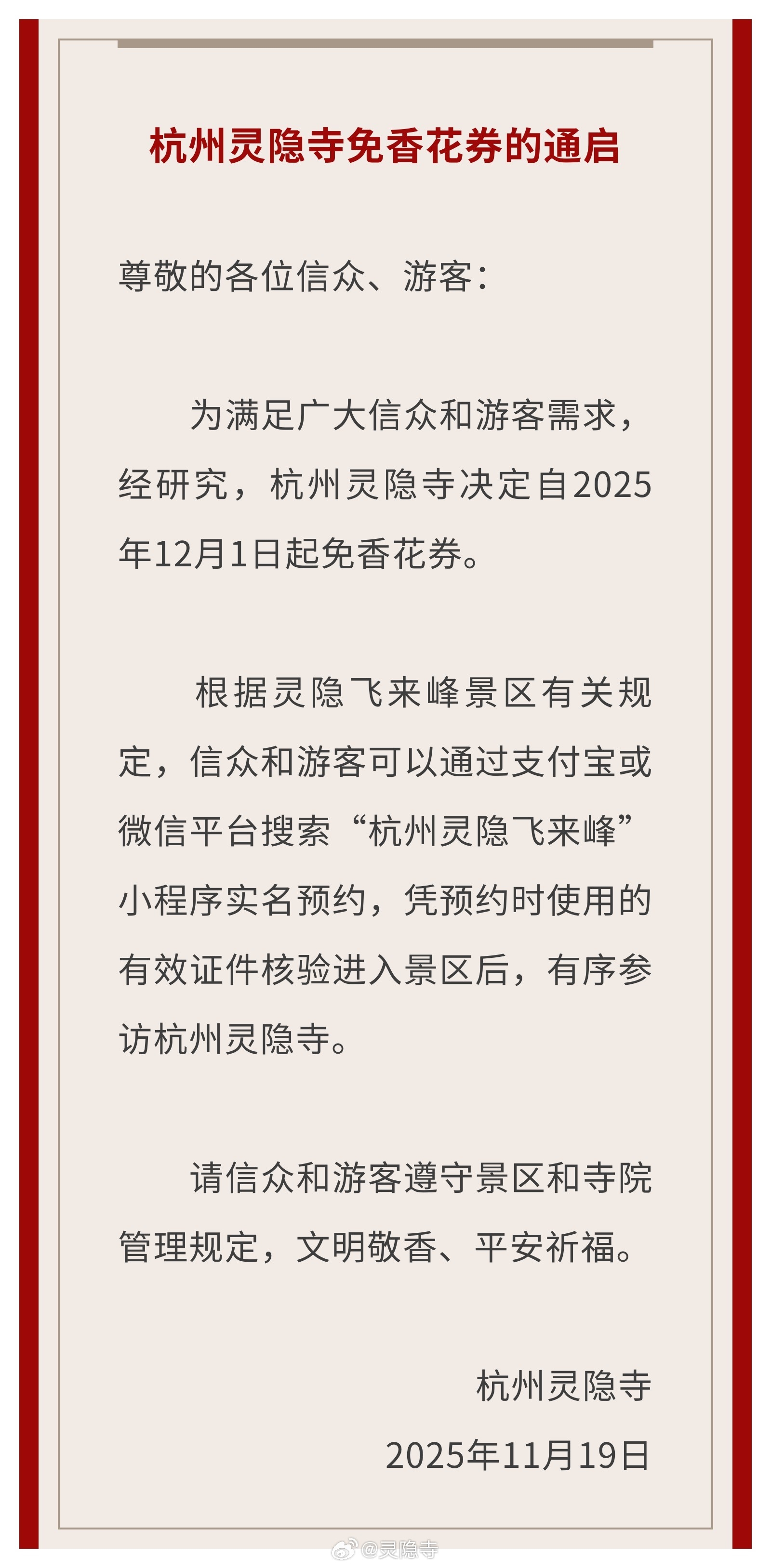 自2025年12月1日起,灵隐飞来峰景区(含灵隐寺、永福寺、韬光寺)实行免票政策,开放时间每日7:30-17:30(17:00停止入园)。