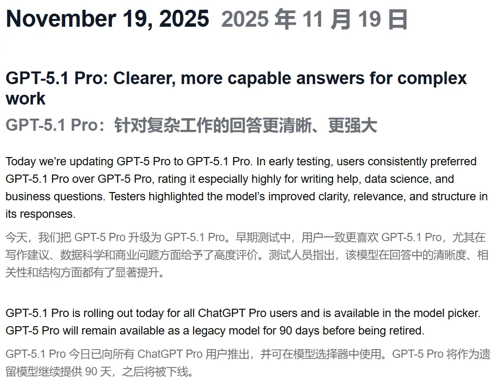 至于GPT-5.1 Pro,正如开篇所说,OpenAI只是在版本更新日志里写了两段介绍。