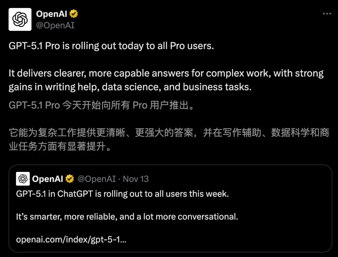 今天,是OpenAI的主场,同一天祭出两大杀器——GPT-5.1 Pro和GPT-5.1-Codex-Max。最强编码模型首次采用“压缩”机制,在数百万token上连续编程超24小时。AI圈一日一更的频率,真的是有点跟不住了....前两天,先是Grok 4.1、Gemini 3 Pro发布,今天OpenAI GPT-5.1 Pro也静默登场了!没有一篇博文,仅有两句话官宣。