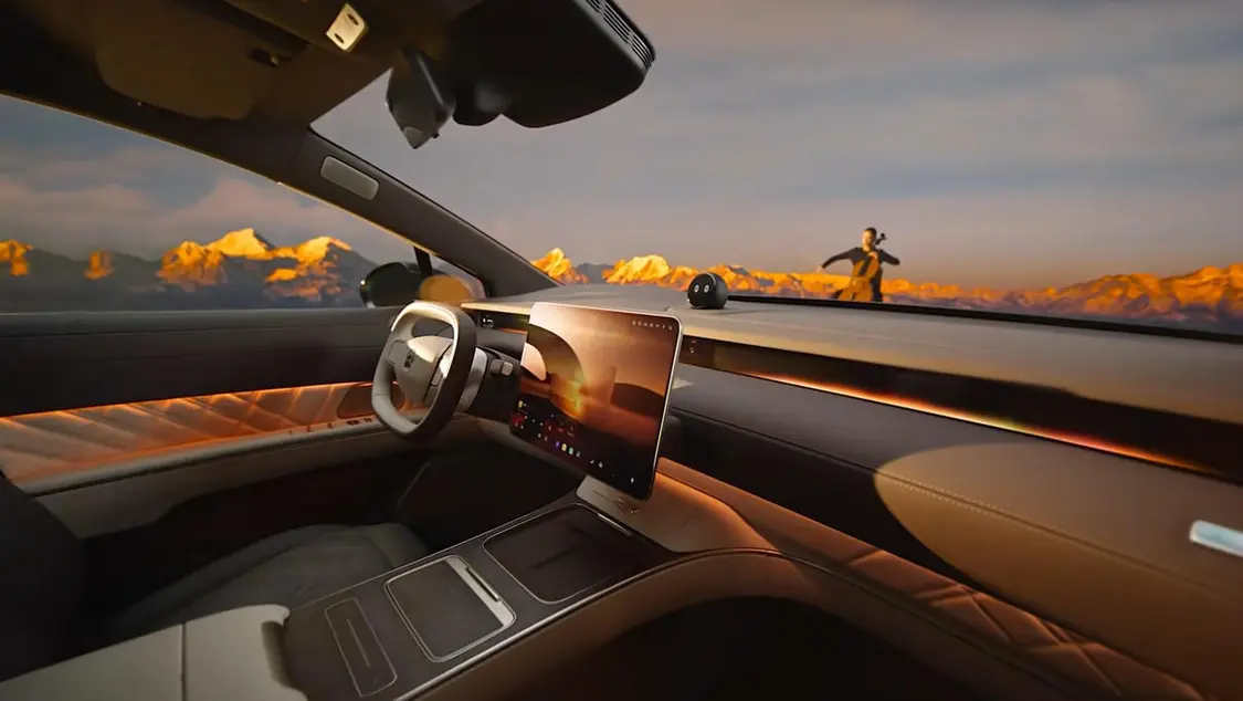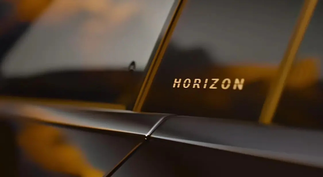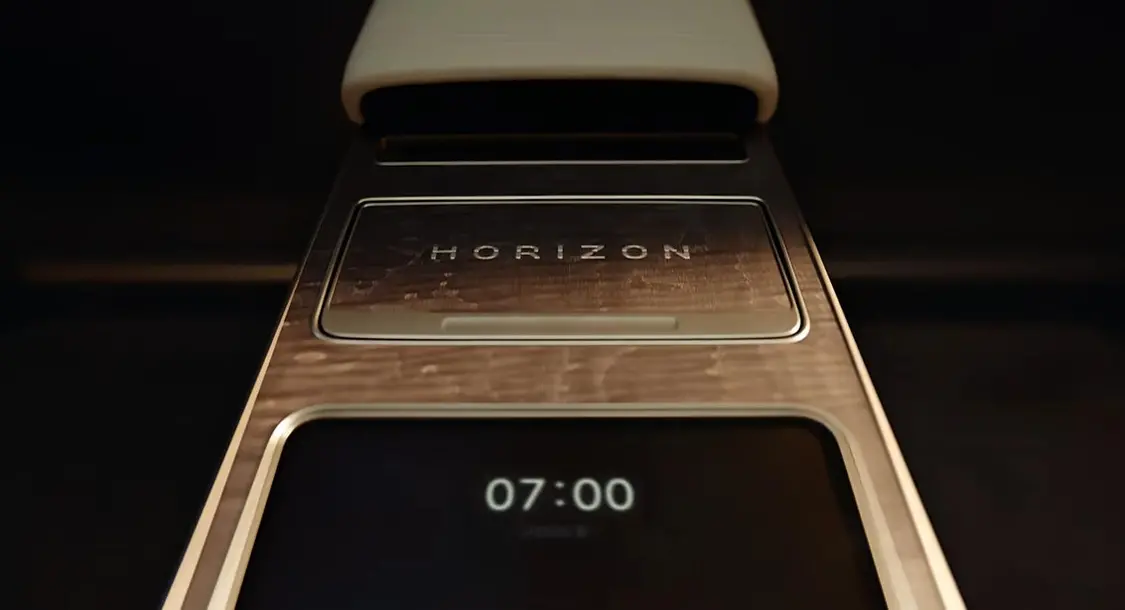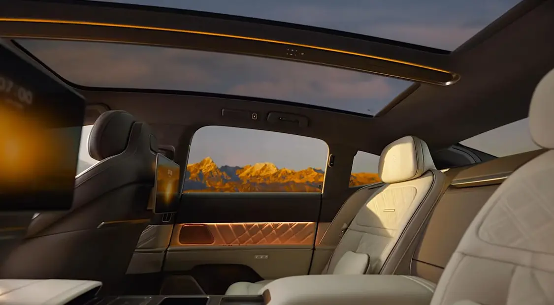 车顶配备了分段式全景天幕,中间集成有纵向的氛围灯带与控制区。后排中央扶手区域宽大,集成了后排行政控制屏幕,屏幕上方同样印有“HORIZON”字样。此外,前排座椅后方还配备了面向后排乘客的娱乐大屏,进一步强调了其后排乘坐体验的定位。