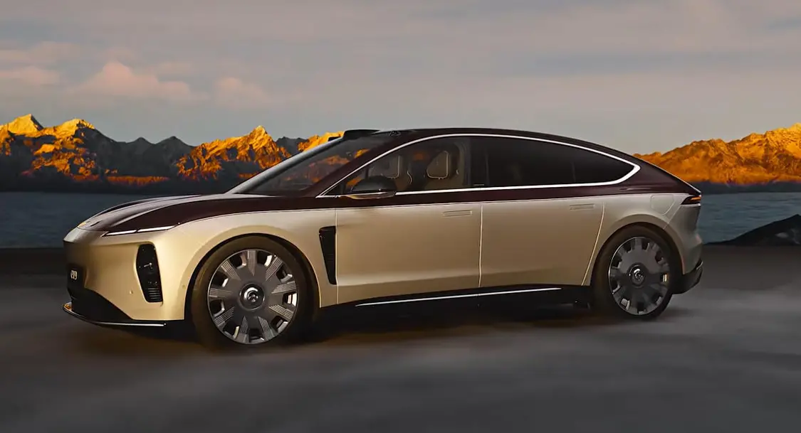 车身上半部分采用了深邃的暗色调,下半部分则为接近金色的暖色调,这种色彩搭配旨在呼应视频主题“日照金山”的视觉意象。在车身侧面细节上,B柱区域镶嵌有金色的“HORIZON”英文标识,这一元素贯穿了整车的多个设计细节。新车配备了大尺寸多辐轮毂及悬浮式轮毂盖,在车轮转动时,中央的蔚来Logo始终保持垂直地面的静止状态。