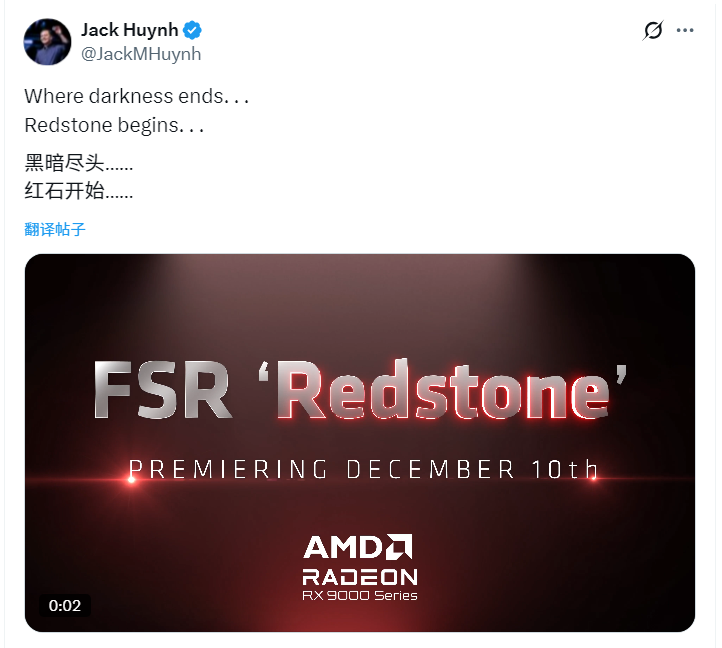 AMD计算与图形事业部高级副总裁兼总经理Jack Huynh在社交媒体上发布官方预告,确认FSR Redstone更新已准备就绪,并定于12月10日正式发布。FSR Redstone更新被视为Radeon驱动和FSR软件堆栈的最大一次升级,它将全面拥抱机器学习(ML)和AI。