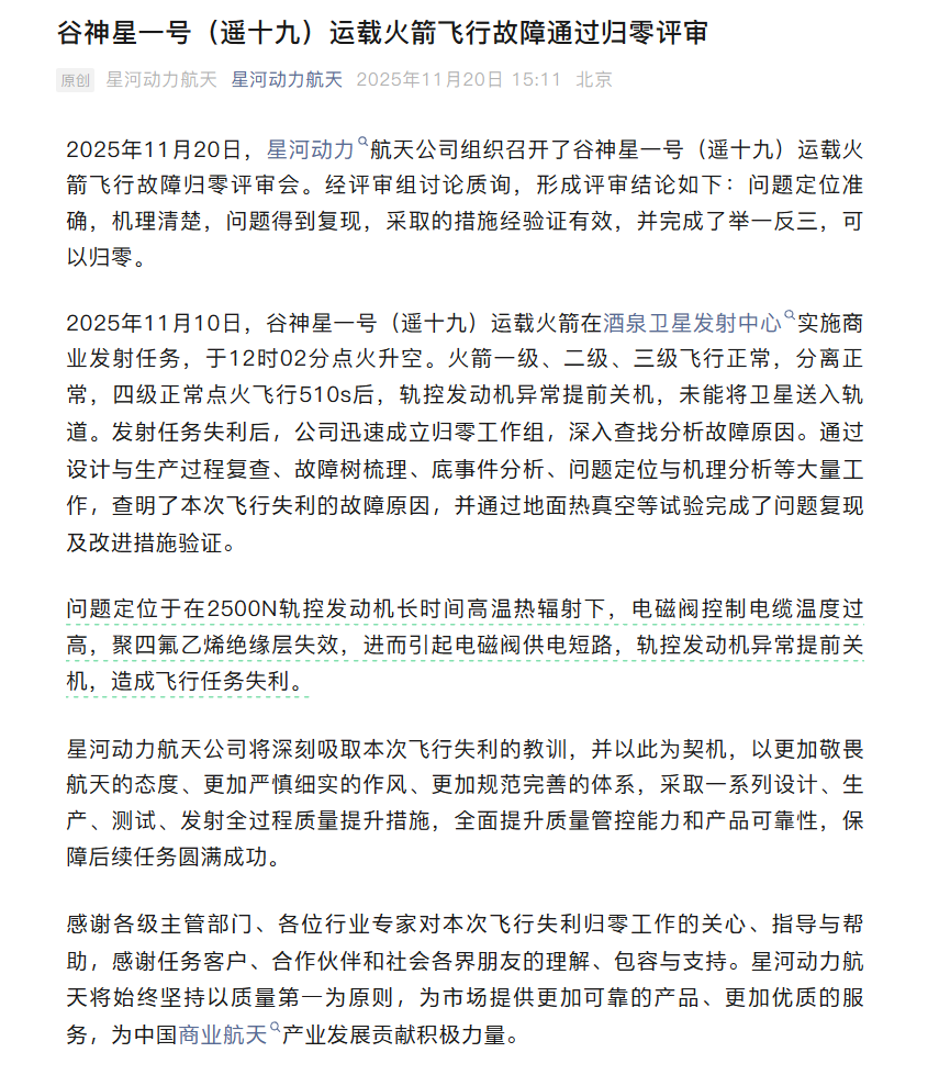 根据官方公告,星河动力航天今天组织召开了飞行故障归零评审会,形成评审结论如下:问题定位准确,机理清楚,问题得到复现,采取的措施经验证有效,并完成了举一反三,可以归零。