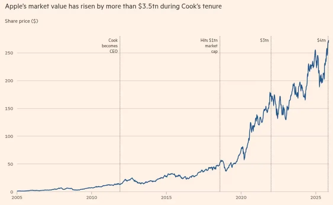 过去一个月,iPhone 17的强劲需求一度将苹果的市值推高至4万亿美元以上。加上库克上任之初推动的大规模股票回购这一强劲助力,苹果股价自2011年他接任以来已上涨20倍。