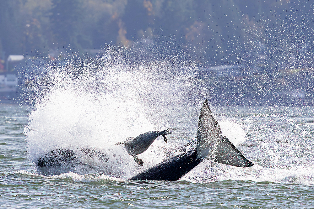 在华盛顿州海域经常出现的虎鲸有三种,分别是以鱼类为食的定居型虎鲸、以哺乳动物为食的过境型虎鲸和以鱿鱼鲨鱼为食的近海型虎鲸。