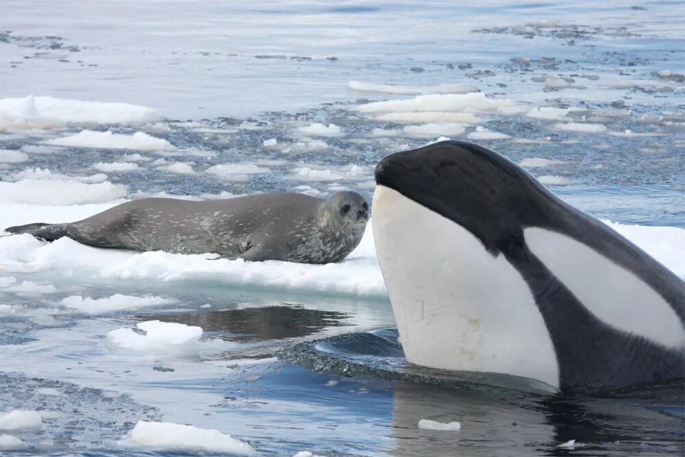 首先,它们会先确定海豹的位置,在水里它们是能感知到的,若海豹是在浮冰或者其他物体之上时,虎鲸则会把身体直立,脑袋探出水面来确定目标。