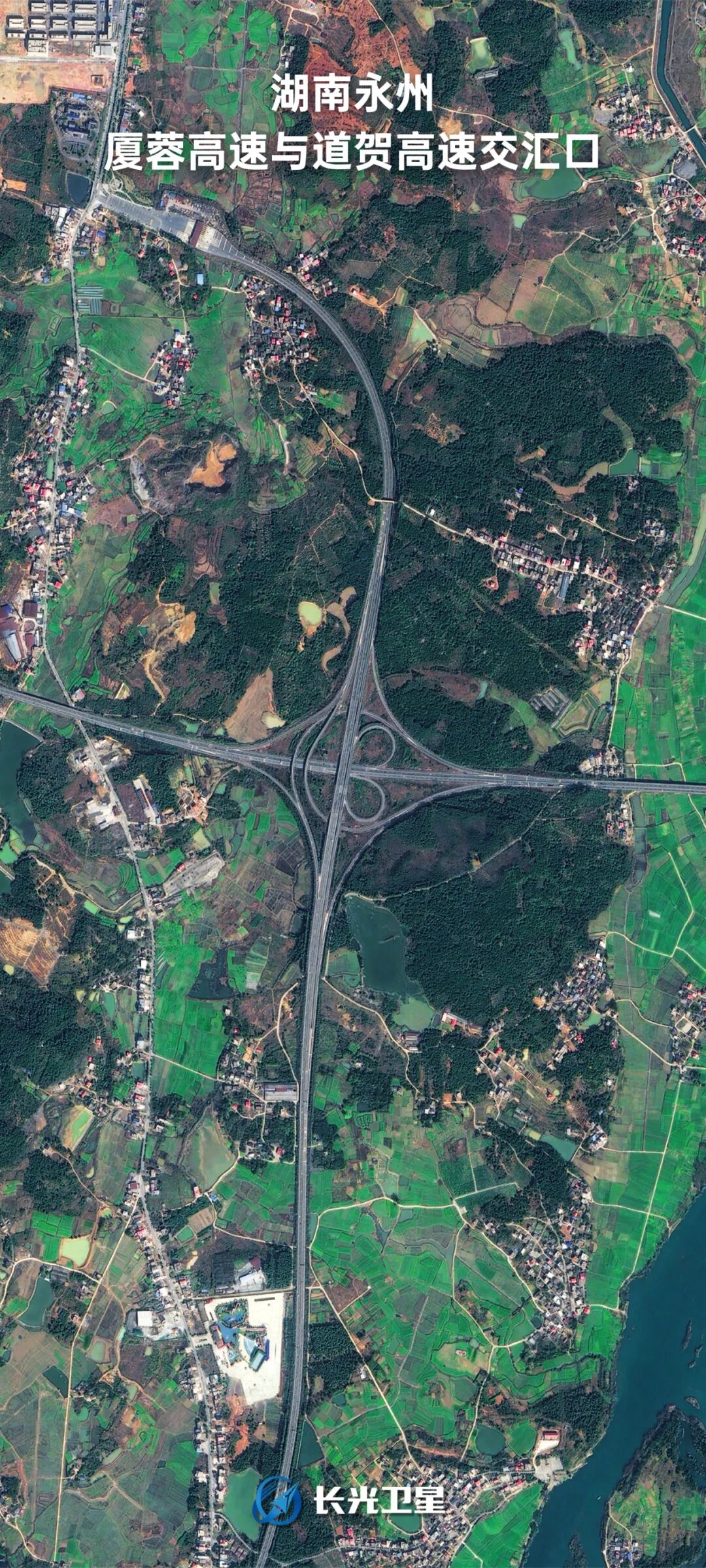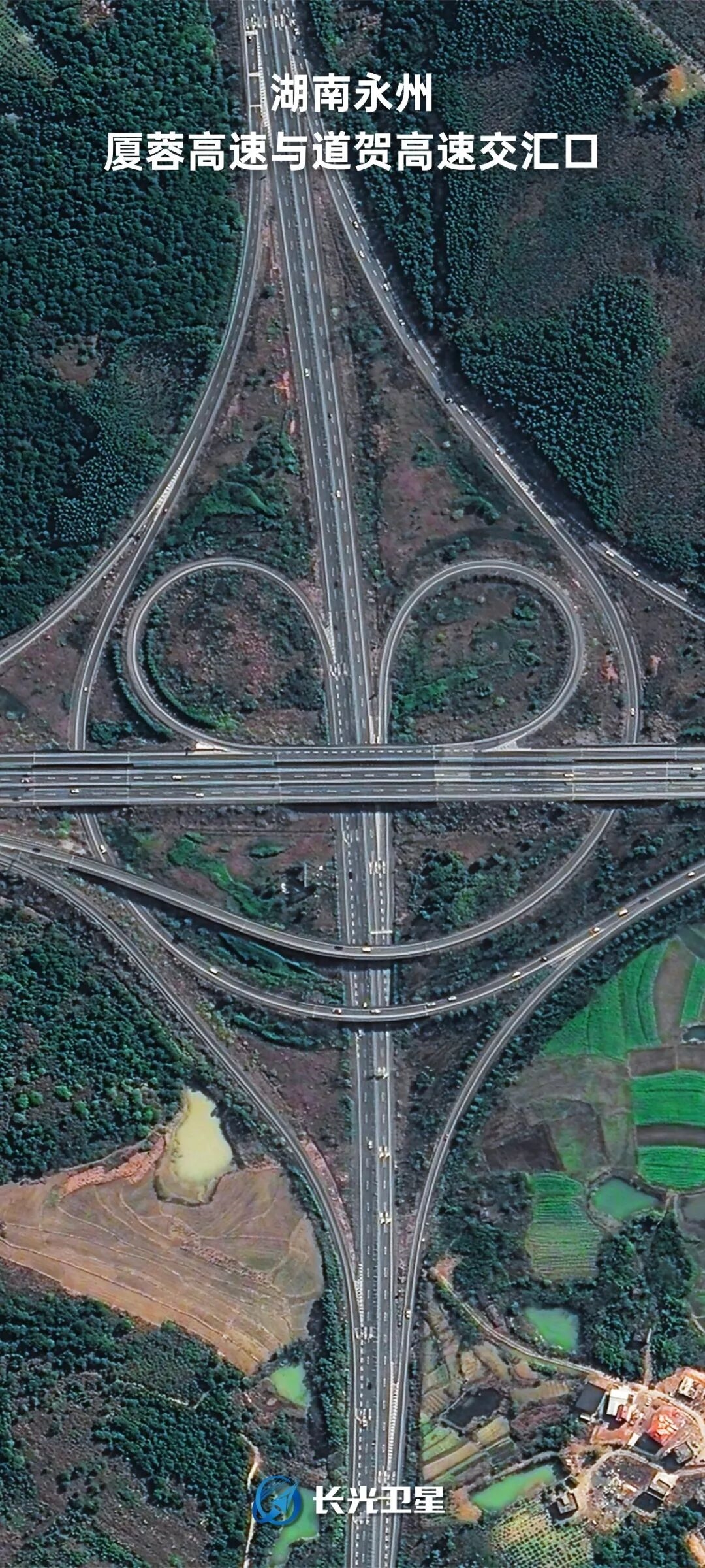 湖南省永州市道县,在厦蓉高速与道贺高速公路的交汇点,弯弯绕绕的高速路,宛如一张圆圆的笑脸。
