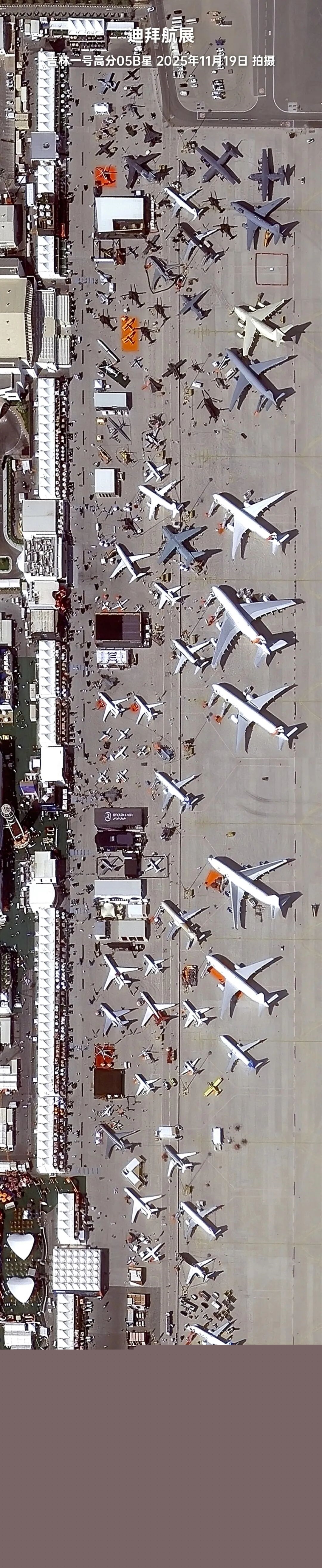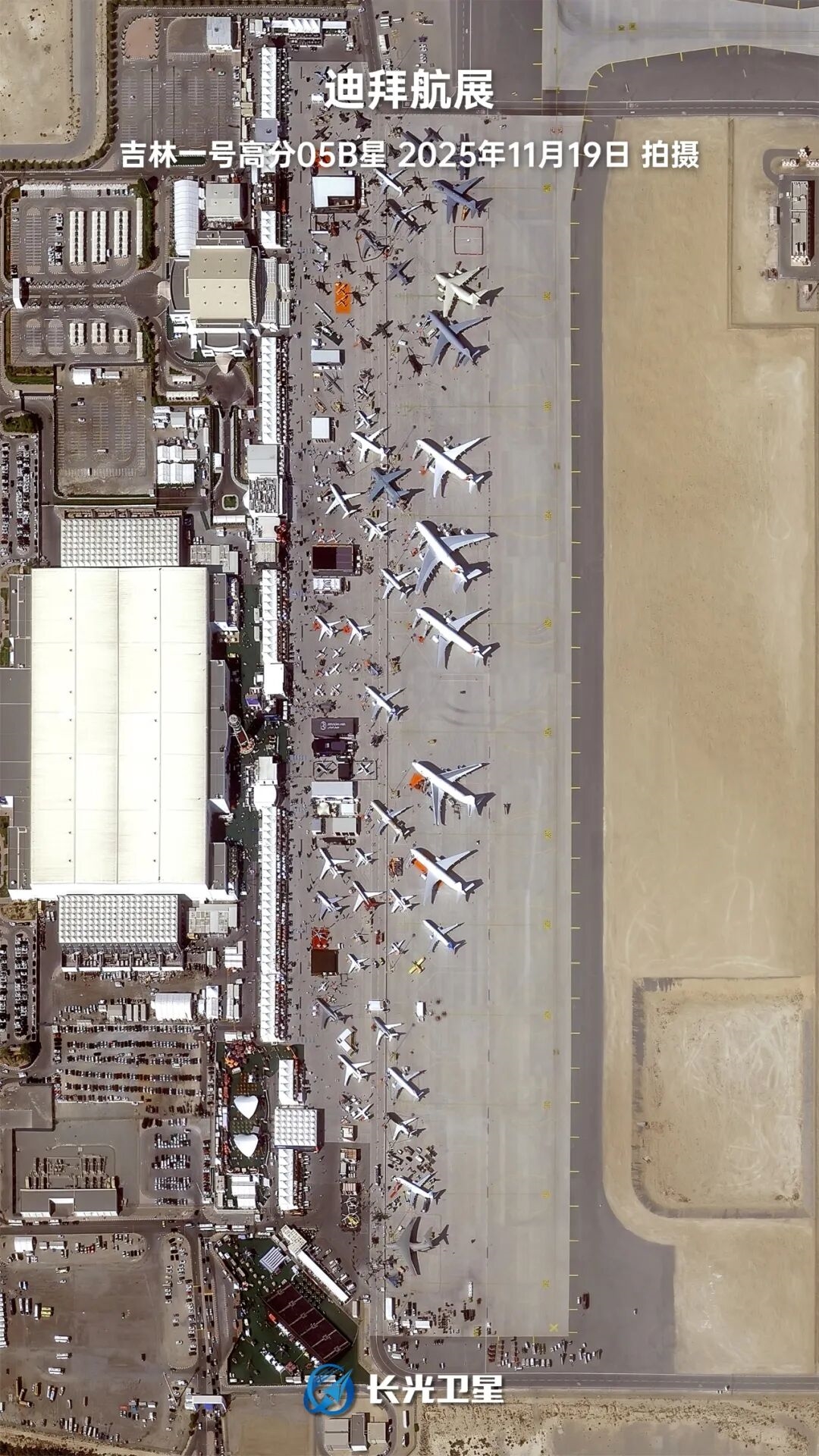 近日,吉林一号卫星从太空捕捉到了第十九届迪拜航展的高清影像,为世界呈现了一场别开生面的“太空观展”体验。2025年迪拜航展于11月17日至21日举行,阿联酋媒体称这是“规模最大、内容最丰富”的一届,吸引了1500多家参展商,接待观众约15万人,展出各型飞机超过200架,涵盖商用机、军用机、公务机、无人机,以及先进航空技术。