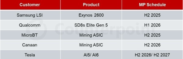 报告同时披露了五大核心客户名单:特斯拉AI芯片、三星自研Exynos 2600处理器、MicroBT与Canaan的加密货币挖矿芯片,以及高通第五代骁龙8s Elite移动平台。