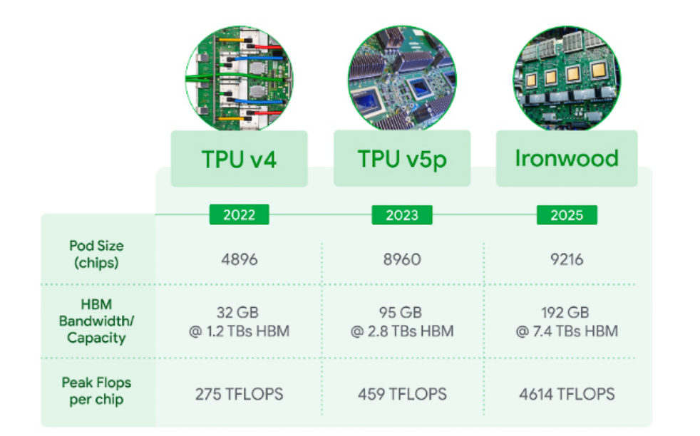 Google今年4月份公布了自研的第七代TPU平台,代号Ironwood,配备192GB HBM内存,带宽7.4TB/s,单芯片性能达到了4614TFLOPS,第五代TPU的10倍性能,同时每瓦性能是第五代的6倍左右。