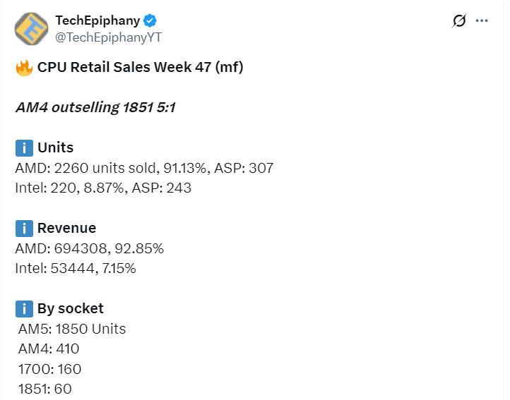 Intel表现最好的是i5 14600K和酷睿Ultra 7 265K,但也仅分别售出20颗,与AMD的明星产品相形见绌。