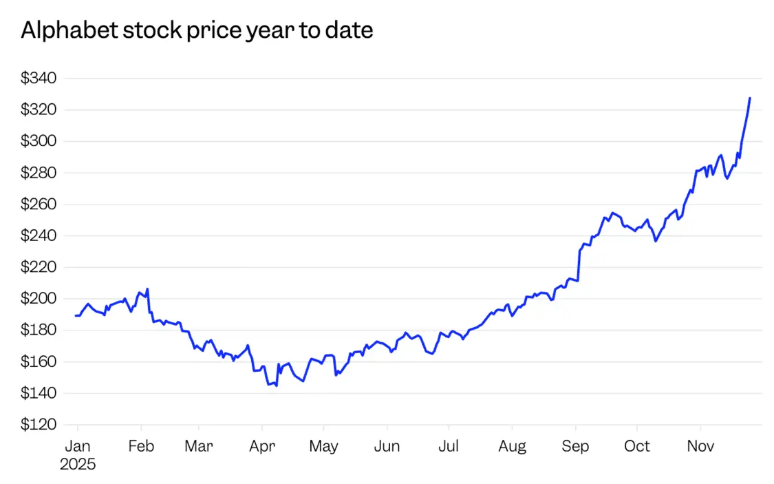 然而,接近三年后,Google完成了一次不可思议的逆转。该公司全新的AI模型Gemini 3被证明是一次成功,以至于Salesforce CEO马克·贝尼奥夫(Marc Benioff)宣布他将从ChatGPT转向使用Gemini 3。Google的市值刚刚超越了微软,并且正朝着4万亿美元俱乐部迈进。今年,Google母公司Alphabet股价上涨了近70%。