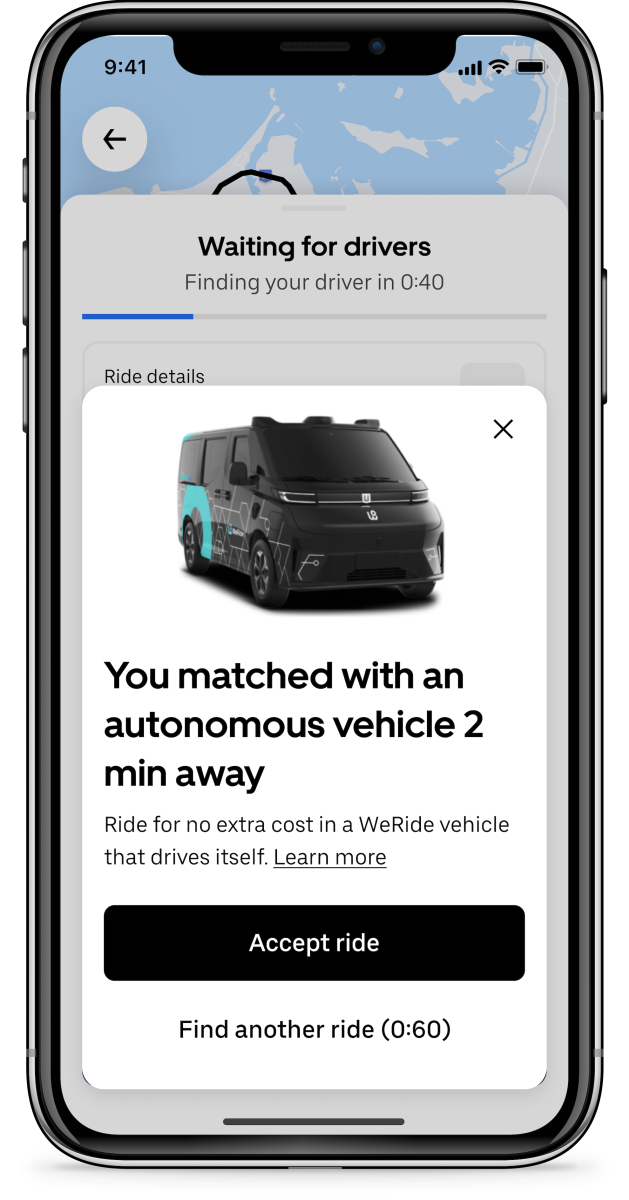 这项服务的运营模式类似于Uber在美国奥斯汀与Waymo的合作。阿布扎比用户只需在Uber应用中选择Uber Comfort或UberX,即有机会匹配到WeRide的自动驾驶车辆。如需进一步提升搭乘到全自动车辆的几率,用户可在App内直接选择“Autonomous(自动驾驶)”选项。目前,Uber与WeRide还与车队运营方Tawasul共同推进合作。