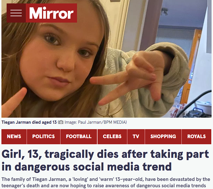 当地时间本月8日,英国莱斯特郡瑟马斯顿,13岁女孩蒂根・贾曼在卧室中被发现昏倒,经抢救无效死亡,尸检结果显示,她死于吸入过量除臭剂中的丁烷气体。据了解,今年3月,蒂根开始参与流行于TikTok等社交平台的“chroming”挑战。