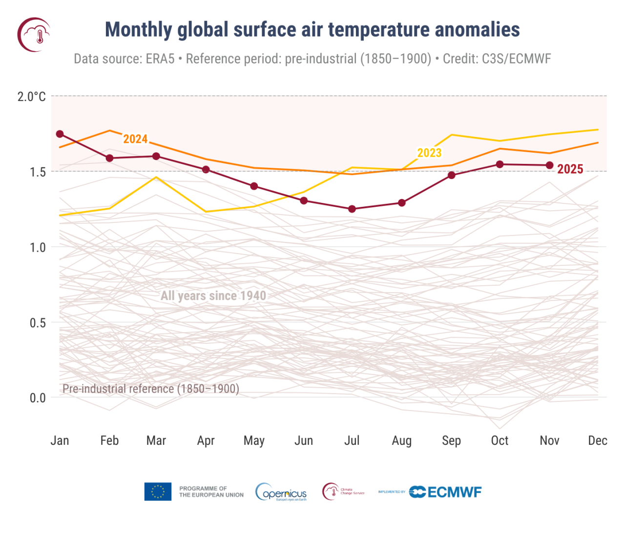 这份月度气候更新显示,2025年11月全球平均地表气温为14.02°C,比1991-2020年11月平均值高出0.65°C,位列第三暖11月,仅次于2023年和2024年。该月气温较工业化前(1850-1900年)平均水平高1.54°C,为继2025年10月后第二个超过1.50°C的月份。1至11月全球平均气温异常值为1991-2020年平均以上0.60°C,或工业化前参考以上1.48°C,与2023年全年相同,后者目前为第二暖年。2025年几乎确定将以第二或第三暖年结束,可能与2023年持平,仅次于纪录最暖的2024年;同时,2023-2025年三年平均气温很可能首次超过工业化前1.5°C。