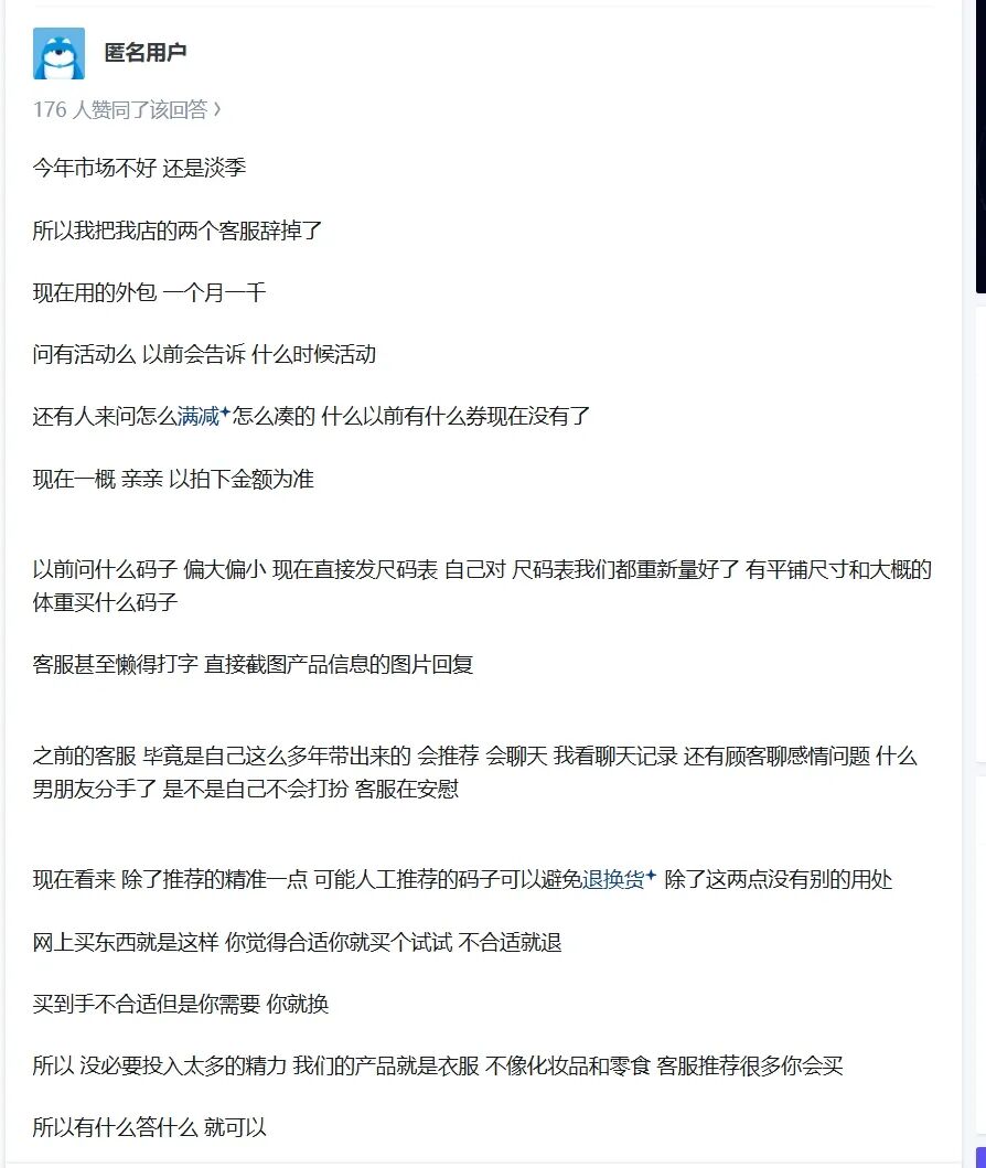知乎上有不少老板现身说法,大家都公认最好的还是官方客服,越熟悉的越能提供最好的服务,这道理没人不懂,但到降本增效的时候,都给砍了。