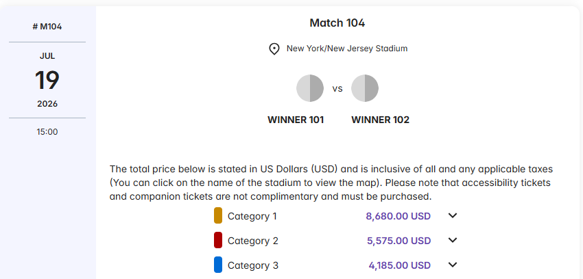 根据FIFA官网上的定价表,世界杯决赛的“经济票”起价为4185美元(约合2.95万元人民币),“标准票”为5575美元(约合3.93万元),“高端票”则为8680美元(约合6.12万元)。
