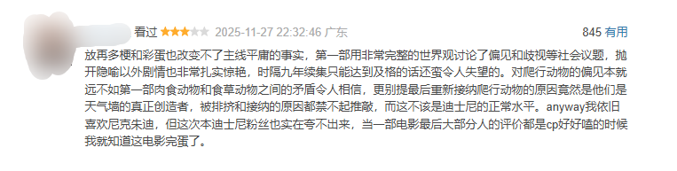 在热门影评中,有观众直言:“放再多梗和彩蛋也改变不了主线平庸的事实,第一部用非常完整的世界观讨论了偏见和歧视等社会议题,抛开隐喻以外剧情也非常扎实惊艳,时隔九年续集只能达到及格的话还蛮令人失望的。”
