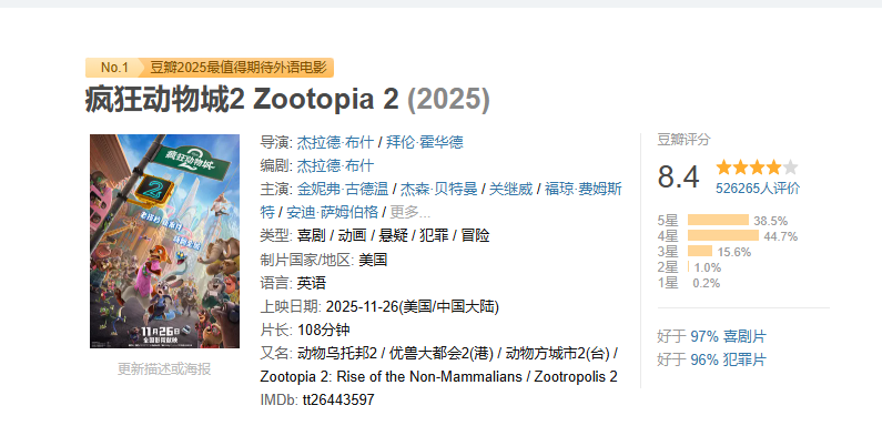 据灯塔专业版实时数据,截至今天13时56分,影片《疯狂动物城2》票房突破35亿。豆瓣数据显示,该片开分为8.7分,目前评分已降至8.4分,参与评分人数超过52万。