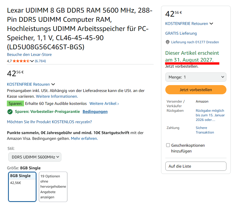 内存涨价下的乱象已经太多了,但我们的想象力还是太贫乏!雷克沙在美国亚马逊上架了一款新的8GB DDR5-5600内存,很标准的普条,时序CL46-45-45-90,电压仅1.1V,无散热马甲。这么个普通的内存标价43.98美元,约合人民币310元,当下可以说十分良心。但问题来了,它如今已开始预售,但是要到2027年8月31日才会开卖,也就是要等超过20个月!