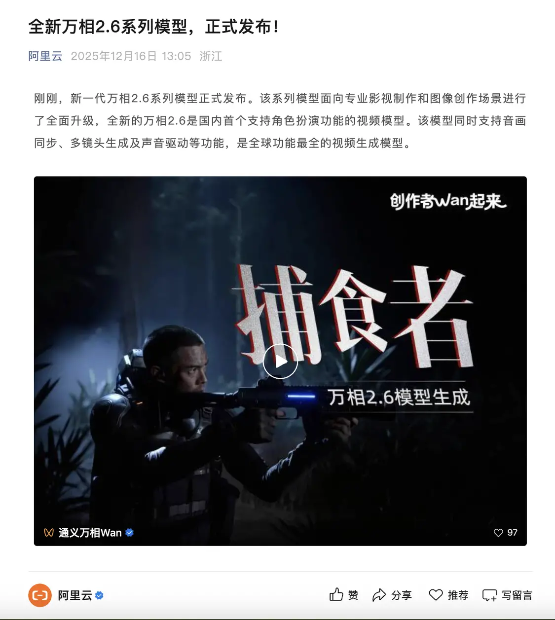 12月16日,阿里巴巴旗下通义万相团队发布了新一代万相2.6系列模型。该版本被定义为国内首个支持角色扮演功能的视频生成模型,同时集成了音画同步、多镜头生成及声音驱动等能力。