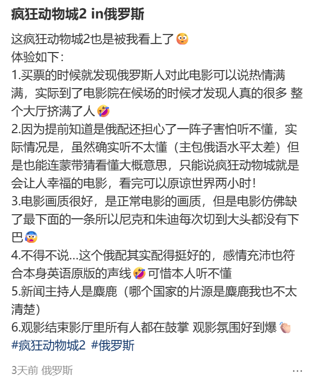 在内容上还有本土化调整,比如把原版熊猫主播换成了驯鹿,搭配的俄语配音不仅口型严丝合缝,还精准还原了朱迪的热血、尼克的狡黠等角色特质,连树懒闪电的慵懒语速都复刻到位,部分观众甚至觉得观影体验不输正版