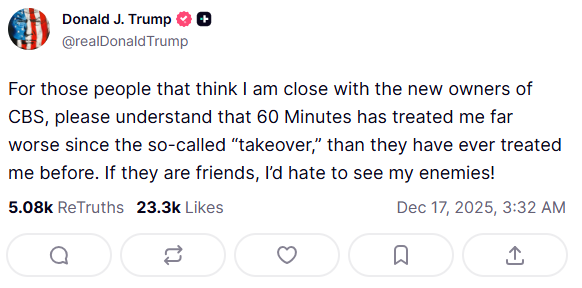 特朗普周三在社交媒体上表示,那些认为他和CBS新东家关系亲密的人应该明白,自从收购以后,《60分钟》节目组对他的态度比以前更加糟糕。如果这些人是他的朋友,那他不敢相信自己的敌人会是什么样。