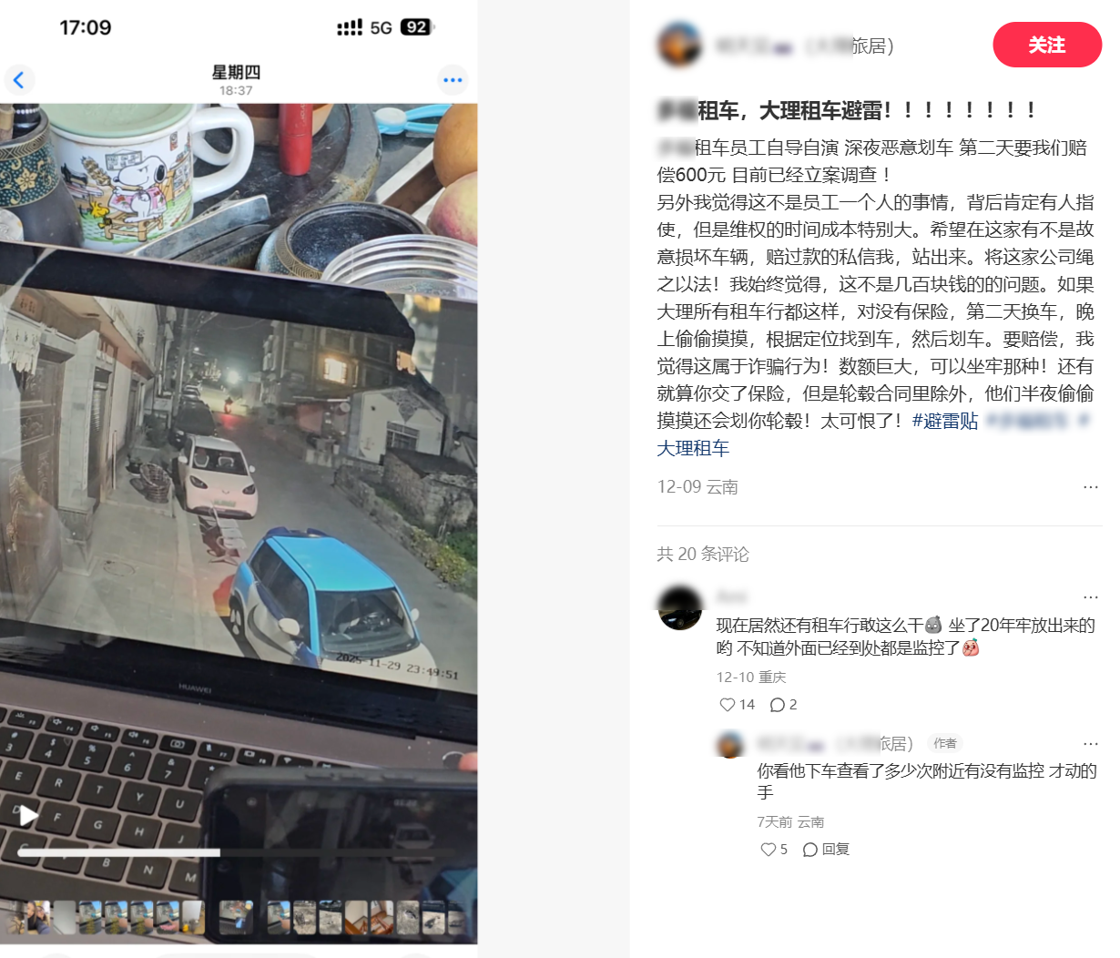 近日,有网友发帖爆料称,云南大理一租车行自导自演,员工半夜偷偷来划伤自己租的车,第二天还车时以此索赔600元。这位网友表示,租车时没有买保险,然后根据定位找到车,晚上偷偷摸摸划车要赔偿,这已经属于诈骗行为了,数额巨大已可以坐牢了;就算你买了保险,但是轮毂不赔,他们还会划你的轮毂,太可恨了。
