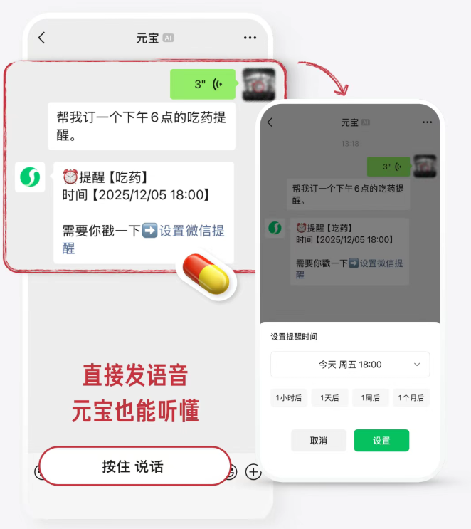针对父母等长辈用户,子女还可教其直接发送语音消息,元宝同样能够识别并设置诸如吃药提醒等日常事务,使用门槛进一步降低。