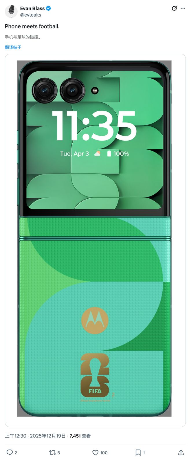 2026年FIFA世界杯进入倒计时阶段,摩托罗拉一款世界杯定制机型提前曝光,据爆料博主Evan Blass披露,摩托罗拉将推出Razr 60 FIFA世界杯特别版。从 Evan Blass发布的渲染图来看,这款小折叠机型在设计上采用了深绿色为主色调模拟足球场草坪,浅青色勾勒球场边线。