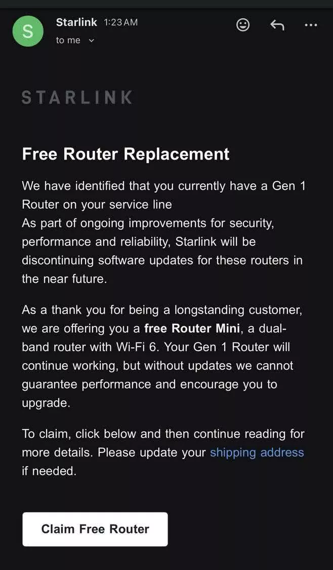公司还向用户保证,更换设备的流程相对简单,并提供详细的操作指引,说明如何拆除 Gen 1 路由器并完成 Router Mini 的安装与配置。 用户只需在邮件中点击“Claim Free Router”(领取免费路由器)按钮,回答一个调查问题并确认提交,便可完成申领流程。