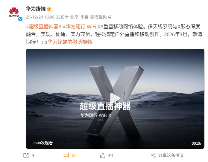华为称其为“超级直播神器”,不过正式发布的时间要稍晚一些,在2026年3月上市。