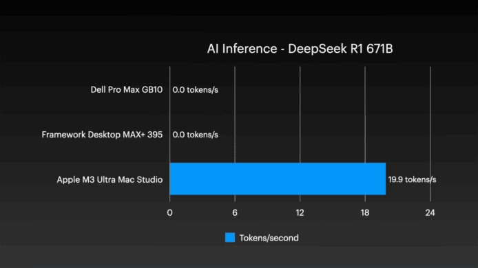 此外,在尝试运行DeepSeek R1 671B超大型模型时,其他系统均无法正常运行,而Mac Studio 集群凭借其1.5TB的统一内存,完成了这一挑战。