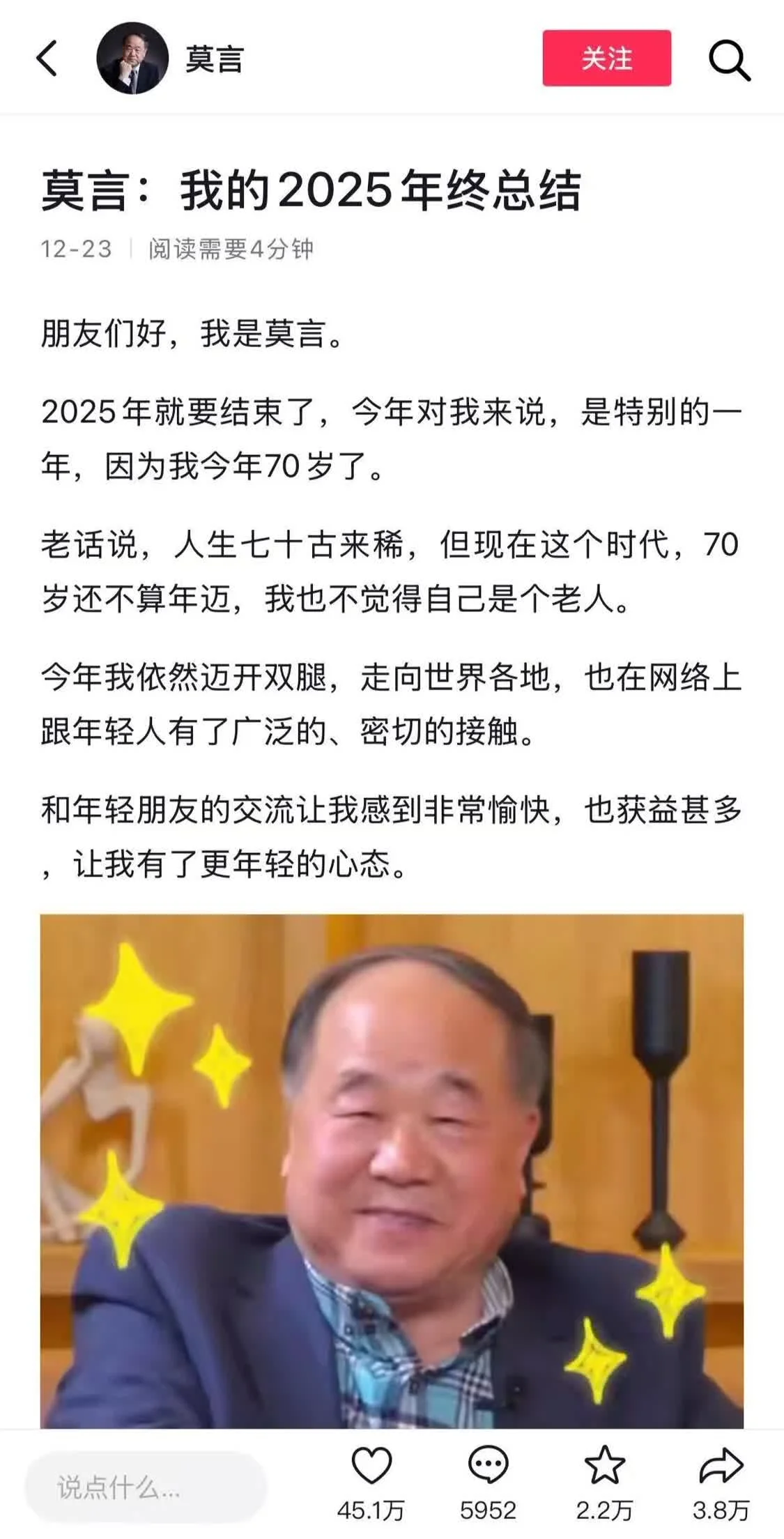 例如,作家莫言通过该功能发布了2025年终总结文章。同时,一批普通创作者发布的个人故事与感悟类长图文也获得了大量关注。此外,不少专业媒体开始使用长图文功能承载深度报道,以满足用户对新闻事件更完整信息的需求。