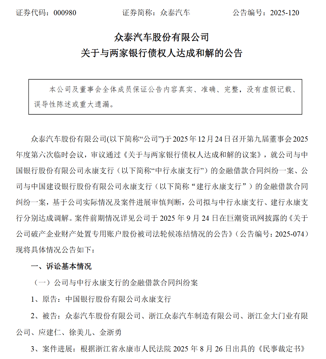 日前,众泰汽车发布公告称,公司已与中国银行永康支行、建设银行永康支行达成债务和解,合计需偿还约4.05亿元。公告显示,此前两家银行因金融借款合同纠纷,申请冻结了众泰破产财产处置专户中的3.35亿股股票及合计约426.42万元银行存款,目前相关冻结已解除。