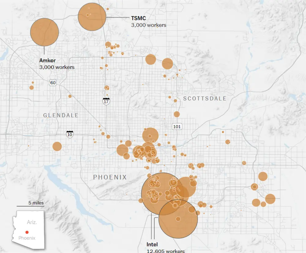 ▲凤凰城大都会区芯片工厂分布(图源:《纽约时报》)