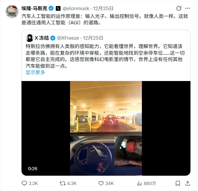 范麟熙表示:“我入手特斯拉的时间比较晚,但却是最早体验FSD v14的用户之一。这或许是我第一次体验到真正通过图灵测试的人工智能:结束一天漫长的工作后,你只需按下按钮,放松身心,却分不清是神经网络还是真人把你送回家。”