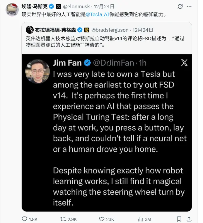 周三,英伟达华裔人工智能总监Jim Fan(范麟熙)罕见地将特斯拉大大表扬了一番。他在X上对FSD测试视频的回复中,将特斯拉FSD称作“神一般的技术”。