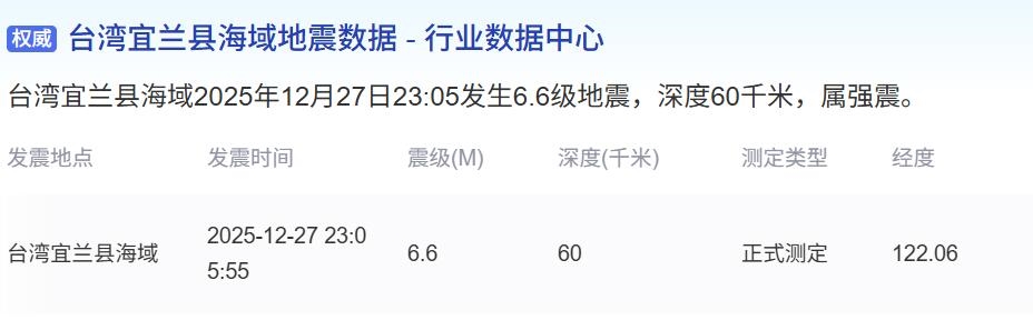 12月27日消息,中国地震台网正式测定:12月27日23时05分在台湾宜兰县海域(北纬24.67度,东经122.06度)发生6.6级地震,震源深度60千米。评论区不少网友表示,福建震感超级明显。