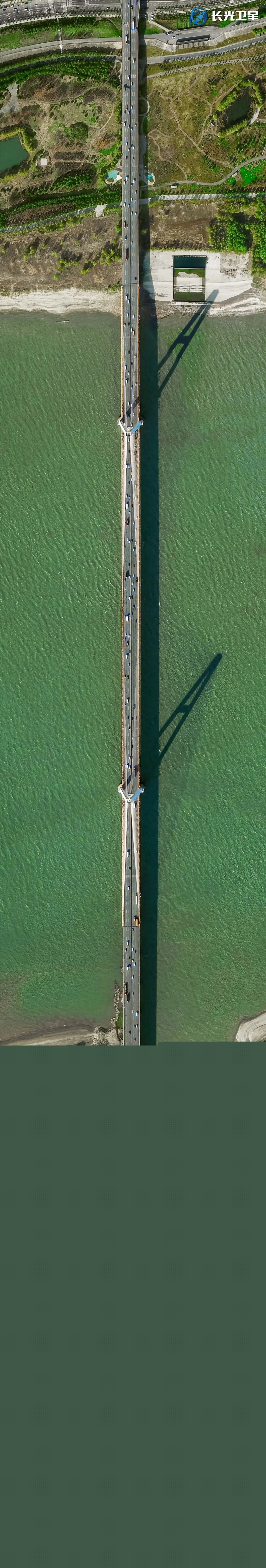 白沙洲大桥巨大的斜拉索在江面上投射出线条分明的平行阴影,与桥上川流不息的车流光影一同律动。