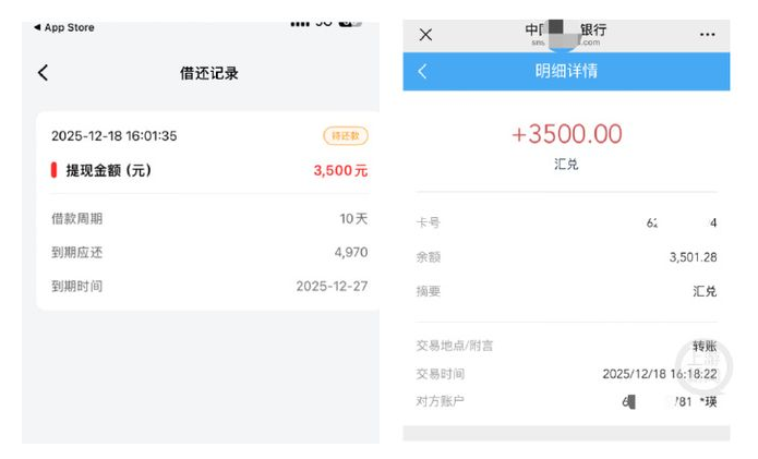 当天16时许,宫先生的银行卡收到一笔3500元转账,转账方显示为私人账户,而非任何金融机构。打开App后,他发现借款信息标明:周期10天,到期应还4970元。