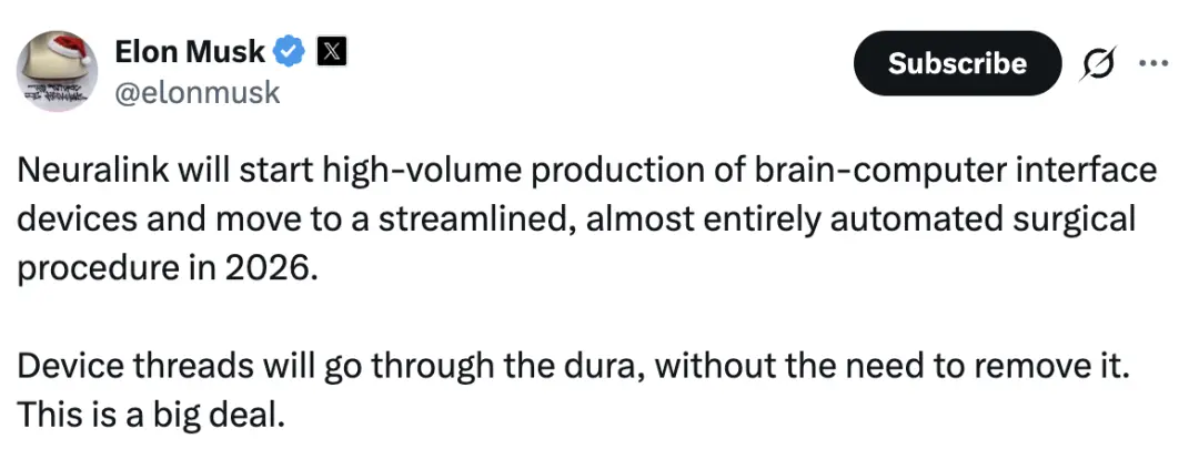 马斯克的脑机接口,今年就要开始量产了。新年第一天,老马就在X上高调立下flag,宣布要把Neuralink从实验室推向临床:Neuralink将于2026年开始大规模生产脑机接口设备,并转向一种精简、几乎完全自动化的手术流程。