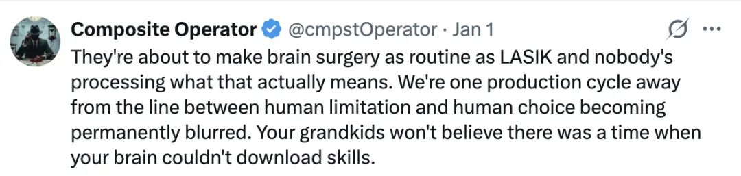 他认为,在ASI必然出现的那一天,人类只有拥有与硅基智能相当的高带宽接口,才不至于沦为“被圈养的宠物”。