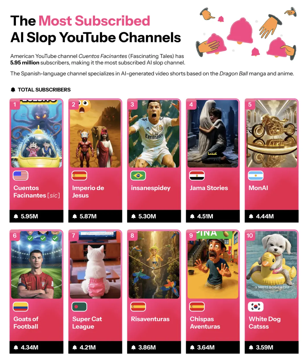 在一些国家,这个数字甚至高得惊人:在西班牙约有2000万人关注热门AI频道,几乎接近全国人口的一半;埃及的AI频道粉丝规模约1800万,美国约1450万,巴西也有1350万……