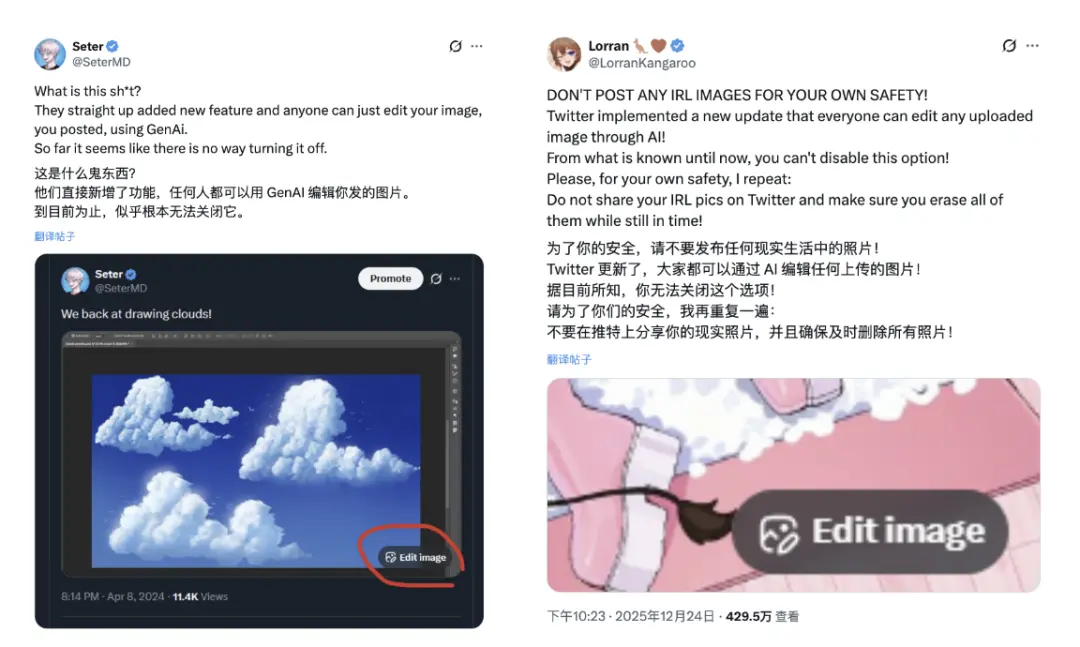 最近一些平台推出的AI编辑、二创功能也放大了这种焦虑,比如在X平台,现在任何人都可以直接对已有内容进行AI修改,于是乎很多原创创作者就不买账了: