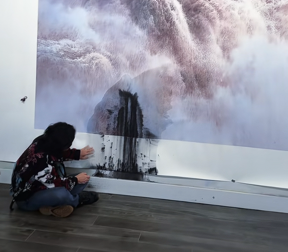 徐惠君在完成画作主体创作、比对好落款位置后,因饭点临近将墨盆暂放于脚手架上,打算餐后完成最后一道工序,却意外发生泼墨事件,墨渍呈不规则形状,破坏了画面原有构图平衡。