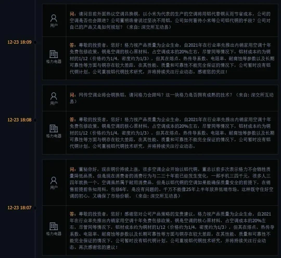 月底的时候,格力又在互动平台明确表示,公司暂时没有铝代铜计划。